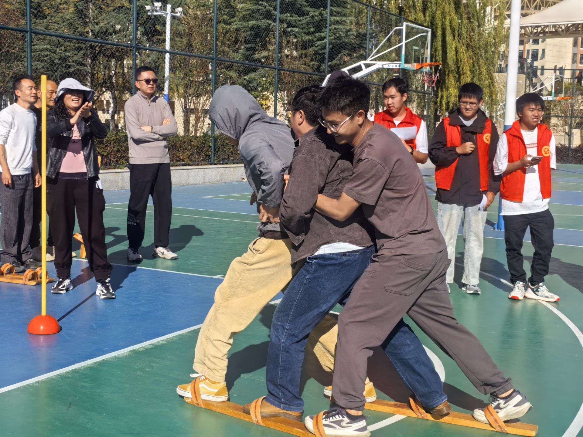 11月7日下午,板鞋竞速赛在室外灯光篮球场率先开赛。伴随着发令哨响,每组三名教师双脚分别固定在长约一米的特制木板上,以绑带紧缚脚踝,协同前行。比赛一开始,便吸引了众多观众驻足围观,场边迅速围满了热情助威的教职工。赛场上,队员们或手拉手、或环抱腰,齐喊“一二、一二”或“左、右、左”的口号,身体微倾,步伐谨慎而有力。部分队伍因节奏不一出现晃动,甚至出现险些绊倒的情况,但队员们迅速调整,经过配合与适应渐趋协调。对面接力的队员则提前准备换鞋、交接,待队友抵达,迅速完成换装,继续前行。临近终点,各参赛队纷纷提速冲刺,木板击地声与加油呐喊声交织成赛场最动人的旋律。比赛途中尽管偶有踉跄,但无人放弃,参赛队员们相互鼓励、及时调整,一步步迈向终点,这一过程生动诠释了“同心同向、行稳致远”的团队理念,也正是丽师全体师生在升本征程中的真实写照。